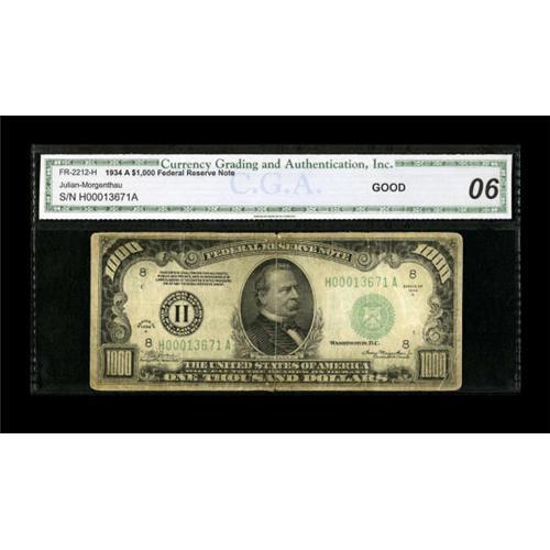 <B>Fr. 2212-H $1000 1934A Federal Reserve Note. CGA Good 06.</B></I><BR> The inks are still bright despite the circulation exhibited.<BR><BR><b>Shipping:</b> Coins & Currency (<a target="_blank" href="http://www.heritageauctions.com/common/shipping.php">view shipping information</a>)