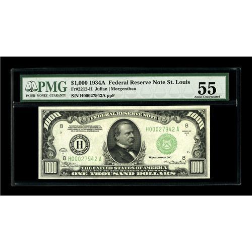 <B>Fr. 2212-H $1000 1934A Federal Reserve Note. PMG About Uncirculated 55.</B></I><BR>This is an attractive note that remains quite bright.<BR><BR><b>Shipping:</b> Coin/Currency (<a target="_blank" href="http://www.heritageauctions.com/common/shipping.php">view shipping information</a>)