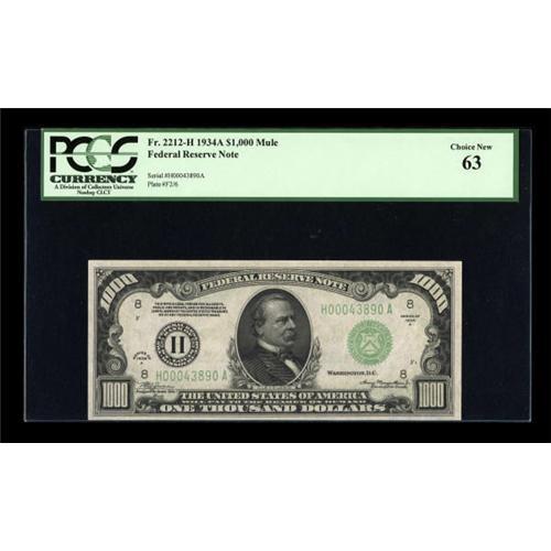 <B>Fr. 2212-H $1000 1934A Federal Reserve Note. PCGS Choice New 63.</B></I><BR> An attractive uncirculated issue with bright paper and deeply printed devices.<BR><BR><b>Shipping:</b> Coins & Currency (<a target="_blank" href="http://www.heritageauctions.com/common/shipping.php">view shipping information</a>)