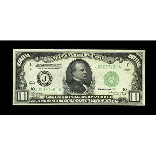 <B>Fr. 2212-J $1000 1934A Federal Reserve Note. Crisp Uncirculated.</B></I><BR>The back is a touch off center, and there is a barely noticeable slightly discolored area on the front which sounds far worse than it actually appears.<BR><BR><b>Shipping:</b> Coin/Currency (<a target="_blank" href="http://www.heritageauctions.com/common/shipping.php">view shipping information</a>)