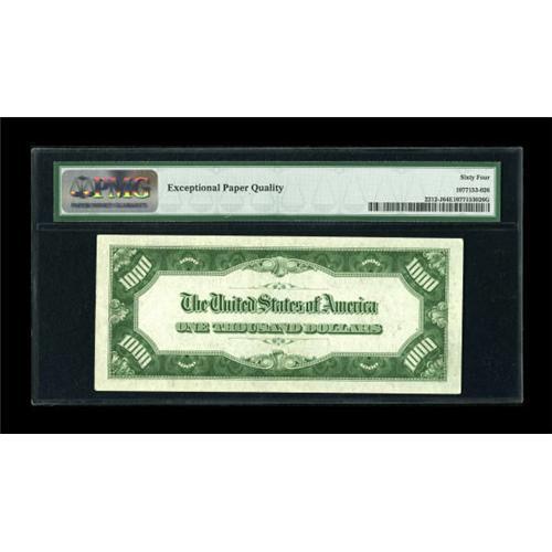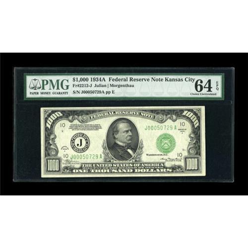 <B>Fr. 2212-J $1000 1934A Federal Reserve Note. PMG Choice Uncirculated 64 EPQ.</B></I><BR> The third in a run of four, and about as nice as these Kansas City notes get these days. Well margined and nicely centered, and displaying bright inks and prominent embossing.<BR><BR><b>Shipping:</b> Coins & Currency (<a target="_blank" href="http://www.heritageauctions.com/common/shipping.php">view shipping information</a>)