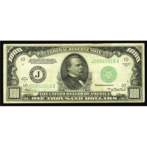 <B>Fr. 2212-J $1000 1934A Federal Reserve Note. Very Fine+.</B></I><BR>A problem free circulated example retaining considerable original crispness.