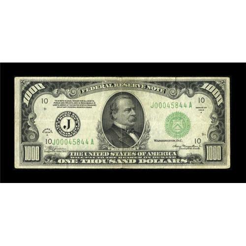 <B>Fr. 2212-J $1000 1934A Federal Reserve Note. Very Fine.</B></I><BR> An evenly circulated thousand with a few minor pinholes common to the grade. <BR><BR><b>Shipping:</b> Coins & Currency (<a target="_blank" href="http://www.heritageauctions.com/common/shipping.php">view shipping information</a>)