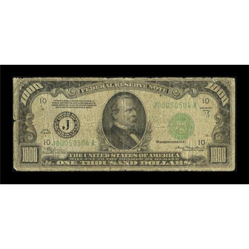 <B>Fr. 2212-J $1000 1934A Federal Reserve Note. Good-Very Good.</B></I><BR> Here is another well circulated example from the KC district that shall remain in collector hands. <I>There will be no returns on this lot for any reason</B></I>.<BR><BR><b>Shipping:</b> Coins & Currency (<a target="_blank" href="http://www.heritageauctions.com/common/shipping.php">view shipping information</a>)
