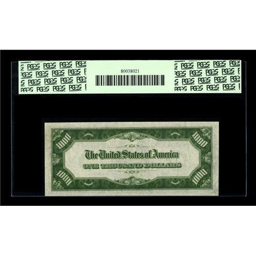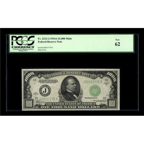 <B>Fr. 2212-J $1000 1934A Mule Federal Reserve Note. PCGS New 62.</B></I><BR>Here is a pleasing example from a district where high grade high denomination notes do not turn up with much regularity. Uneven margins preclude a higher grade. An interesting minor BEP ink smear is seen on the back.<BR><BR><b>Shipping:</b> Coins & Currency (<a target="_blank" href="http://www.heritageauctions.com/common/shipping.php">view shipping information</a>)