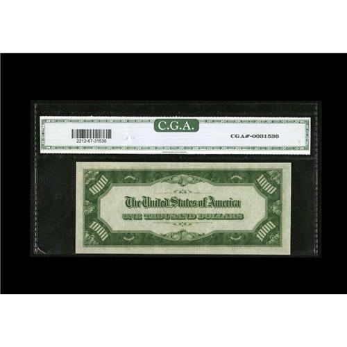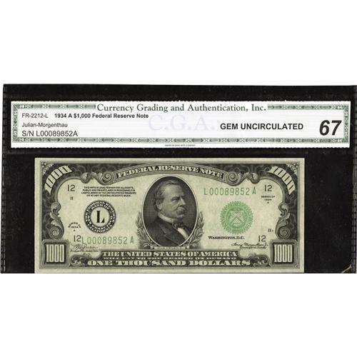 <B>Fr. 2212-L $1000 1934A Federal Reserve Note. CGA Gem Uncirculated 67.</B></I><BR>A nicely centered example front and back with great eye appeal. Embossing can clearly be seen through the third party holder.