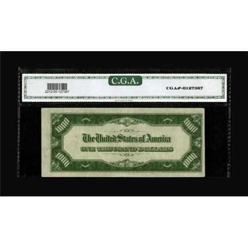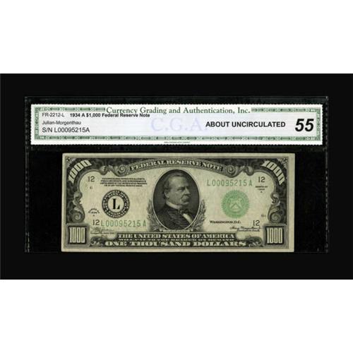 <B>Fr. 2212-L $1000 1934A Federal Reserve Note. CGA About Uncirculated 55.</B></I><BR> A very high end piece which is just a centerfold from the Choice Uncirculated grade.<BR><BR><b>Shipping:</b> Coins & Currency (<a target="_blank" href="http://www.heritageauctions.com/common/shipping.php">view shipping information</a>)