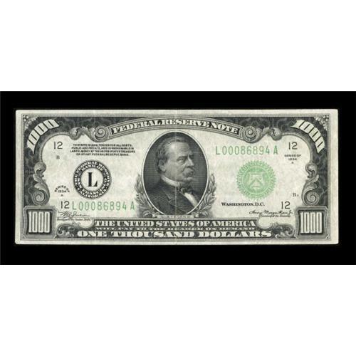 <B>Fr. 2212-L $1000 1934A Federal Reserve Note. Very Fine.</B></I><BR> The center fold is a bit heavy as it has displaced some ink on this San Francisco $1000 FRN.<BR><BR><b>Shipping:</b> Coins & Currency (<a target="_blank" href="http://www.heritageauctions.com/common/shipping.php">view shipping information</a>)