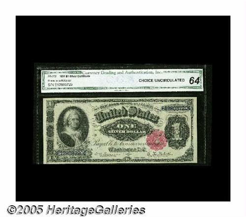 <B>Fr. 222 $1 1891 Silver Certificate CGA Choice Uncirculated 64.</B></I> The original embossing is apparent on this brilliantly colored, broadly margined, scarce Martha. Only about 110 Fr. 222's are known, compared to over 400 of its type-mate Fr. 223. The 64 grade is apparently due to a small spot in the bottom margin. Save for that spot, the note appears far better than its assigned grade.