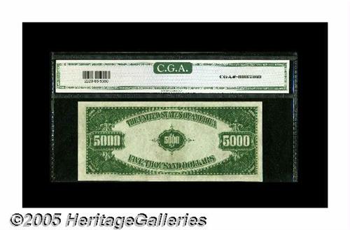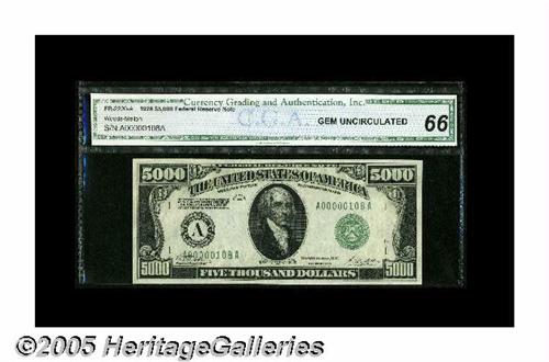 <B>Fr. 2220-A $5000 1928 Federal Reserve Note. CGA Gem Uncirculated 66.</B></I><BR>This is one of four consecutive Boston district Series 1928 $5,000's to surface nearly a decade ago. It's the nicest one of the group, and has been graded as Gem Uncirculated 66 and encapsulated by CGA. It is a truly lovely piece, with vivid colors and virtually perfect face centering. The Taylor Family Collection example, which we sold in February, was a hair less nice than this piece and realized $120,750 after spirited bidding. We see no reason why this superior example will realize any less tonight.