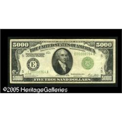 <B>Fr. 2220-E $5000 1928 Federal Reserve Note. Very Fine.</B></I><BR>The new Sullivan census lists just seventeen extant 1928 $5000's, of which only two come from the Richmond district. There are a few minor repaired splits at both the top and bottom margins, but the note is otherwise more than acceptable, and who can find another once this piece is gone? Lot:16597