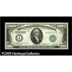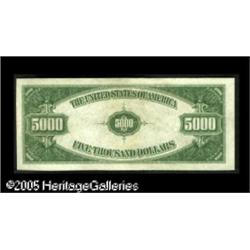 <B>Fr. 2220-J $5000 1928 Federal Reserve Note. Very Fine-Extremely Fine.</B></I><BR>A great rarity which is unique according to Steve Sullivan's new study. With just 720 examples printed from the Kansas City district, it may well remain unique forever. Any estimate is but a surmise, as this rarity is simply irreplaceable at any price, but our best guess here is... Lot:16599