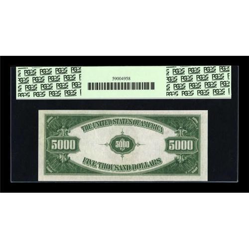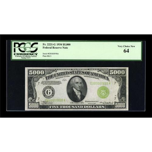 <B>Fr. 2221-G $5000 1934 Federal Reserve Note. PCGS Very Choice New 64.</B></I><BR> A well centered and very bright $5000 note which is very close to the elusive gem grade, having received a rating of Very Choice New 64 by PCGS. The reverse is slightly shifted, which likely prompted the Very Choice New rather than the Gem designation. The last $5000 we offered, which also graded 64, realized a strong $126,500, and we see no reason why this note, which is a truly scarce item in this grade, will not see the hammer fall somewhere in the same vicinity. <BR><BR><b>Shipping:</b> Coins & Currency (<a target="_blank" href="http://www.heritageauctions.com/common/shipping.php">view shipping information</a>)