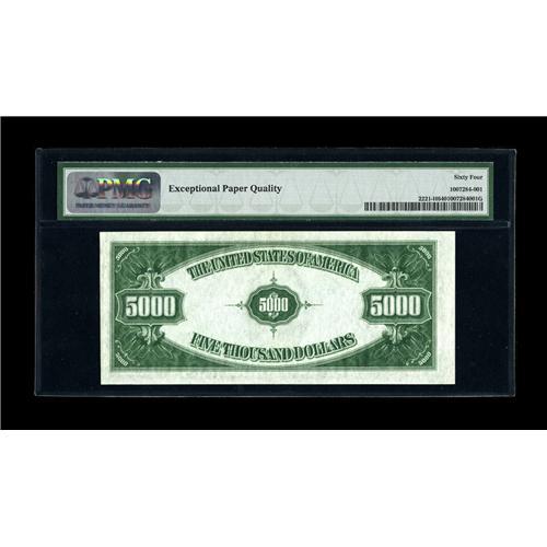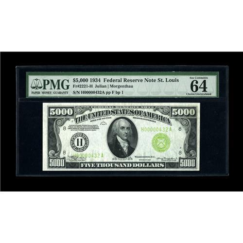 <B>Fr. 2221-H $5000 1934 Federal Reserve Note. PMG Choice Uncirculated 64 EPQ.</B></I><BR>According to the United States Treasury Department a total of 342 $5,000 Small Size notes are still unredeemed but far fewer than that are known in currency circles. We can only speculate how many were destroyed without being checked off the government's register. This piece is a real standout since so many high denomination notes have been pressed and "dolled up" to satisfy collectors. The paper originality exhibited here is nothing short of stunning and is plainly visible through the holder. A colorful lime green overprint remains as bright as it was the day it was printed. All of the attributes are nothing short of Gem quality, including the margins. It is however, the centering that limits the grade as two of the margins are much larger than the others.<BR><BR><b>Shipping:</b> Coin/Currency (<a target="_blank" href="http://www.heritageauctions.com/common/shipping.php">view shipping information</a>)