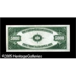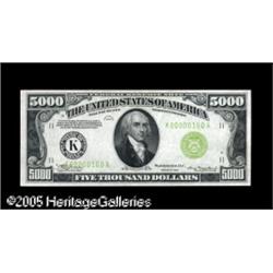 <B>Fr. 2221-K $5000 1934 Federal Reserve Note. Choice About Uncirculated.</B></I><BR>A lovely Dallas district example which is considerably more attractive than many notes graded as uncirculated. It is AU only due to a well hidden corner fold, but the centering, colors, and general appearance are all that could be demanded from any example. Expect this premium piece to bring considerably more than most examples carrying the About Uncirculated label. Lot:16609