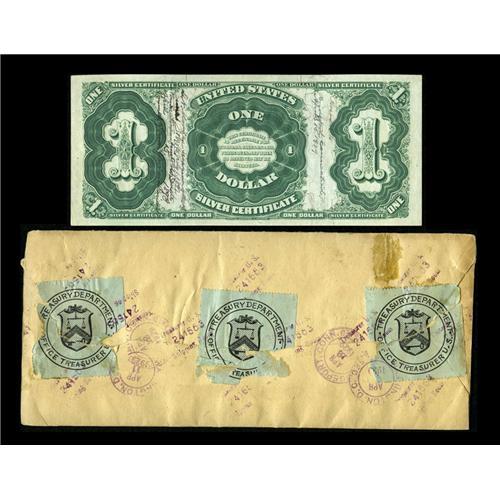 <B>Fr. 223 $1 1891 Silver Certificate Courtesy Autograph Superb Gem New.</B></I> We once again have the pleasure of offering this gorgeous Martha, described at the 2005 FUN sale as, "This Martha is also autographed by Morgan. Unlike the other notes in this offering, it has an additional presentation written on the back of the note in Morgan's hand with the late date of April 15, 1929. Included with this note is a Registry envelope sent from the Treasury Department to Mr. Morgan dated April 12, 1929, which apparently is the envelope that delivered this note at Mr. Morgan's request so that he could sign and present it. The note itself is as lovely and original as all of the others in this select group."<BR><BR><b>Shipping:</b> Coin/Currency (<a target="_blank" href="http://www.heritageauctions.com/common/shipping.php">view shipping information</a>)