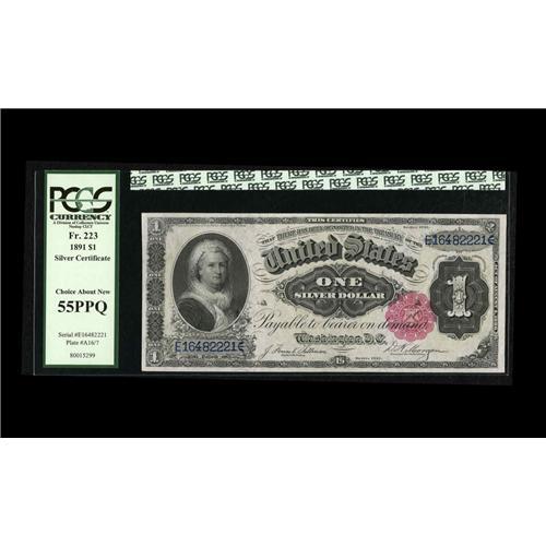 <B>Fr. 223 $1 1891 Silver Certificate PCGS Choice About New 55PPQ.</B></I> Much of the appearance of a Superb Gem, with boardwalk margins, ideal color and easily seen deep, original embossing.