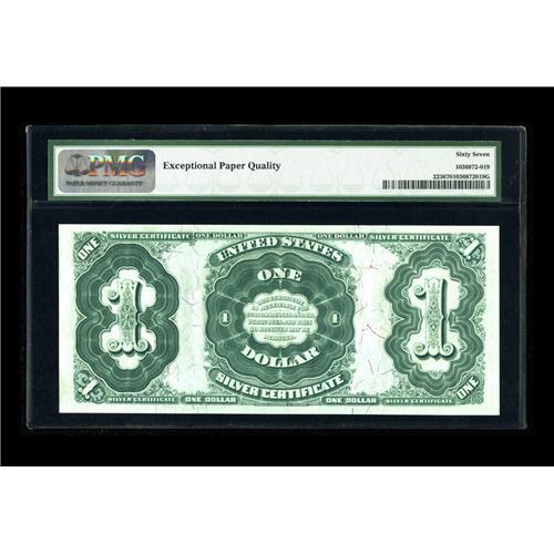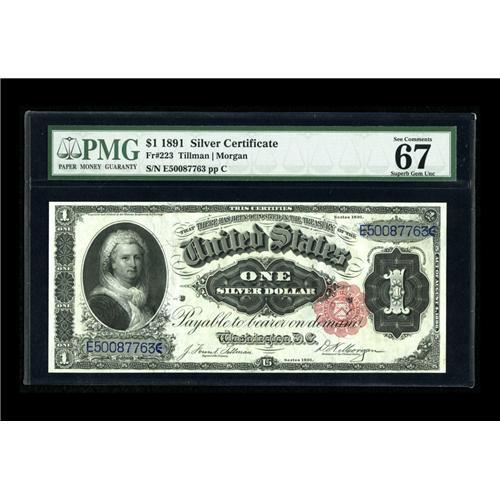 <B>Fr. 223 $1 1891 Silver Certificate PMG Superb Gem Unc 67 EPQ.</B></I> Huge even margins, perfect colors, and great paper originality all come together on this beautiful Martha. This type is quite available up through the choice grade, but it becomes very difficult to locate as a deeply embossed perfect Gem. This piece would satisfy the fussiest of type note collectors.<BR><BR><b>Shipping:</b> Coin/Currency (<a target="_blank" href="http://www.heritageauctions.com/common/shipping.php">view shipping information</a>)