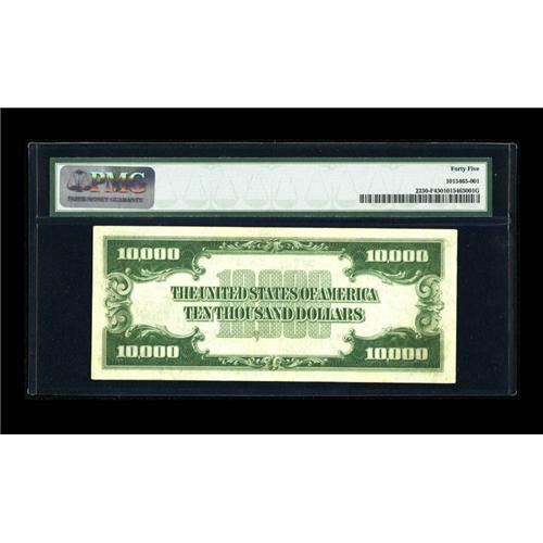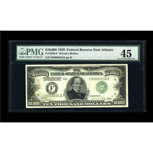 <B>Fr. 2230-F $10000 1928 Federal Reserve Note. PMG Choice Extremely Fine 45.</B></I><BR>This serial number F00000016A $10,000 note increases the census to only nine for all districts for the 1928 Series. Two of those enumerated notes are locked away in the San Francisco Federal Reserve Bank Collection, reducing the number available to collectors to just seven in all grades combined. We had the privilege of selling the finest of the seven, a Choice CU Richmond example, which realized over $241,000 in our February 2005 auction of the Taylor Family Collection. The example presented here is not quite that nice, but it is only lightly circulated and is a strong contender for second finest known for this type and denomination. Offered here to the numismatic community for the first time, a true trophy item that is certain to become the centerpiece of the collection it enters. In a market where truly rare items of all kinds sell for record prices whenever they are offered, expect this prize to easily reach and likely considerably exceed our conservative estimate of...<BR><BR><b>Shipping:</b> Coins & Currency (<a target="_blank" href="http://www.heritageauctions.com/common/shipping.php">view shipping information</a>)