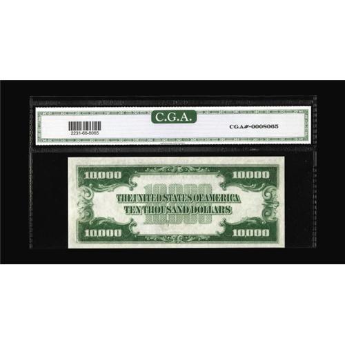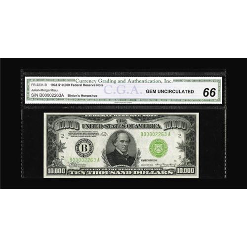 <B>Fr. 2231-B $10000 1934 Federal Reserve Note. CGA Gem Uncirculated 66.</B></I><BR>Bright white paper and embossing can be seen through the third-party encapsulation of this majestic note from the Binion's Horseshoe display. The inks are dark and the note is oh so close to its aforementioned sibling in the previous lot. A splendid example carrying a premium grade for the highest issued United States denomination that is legal to own.