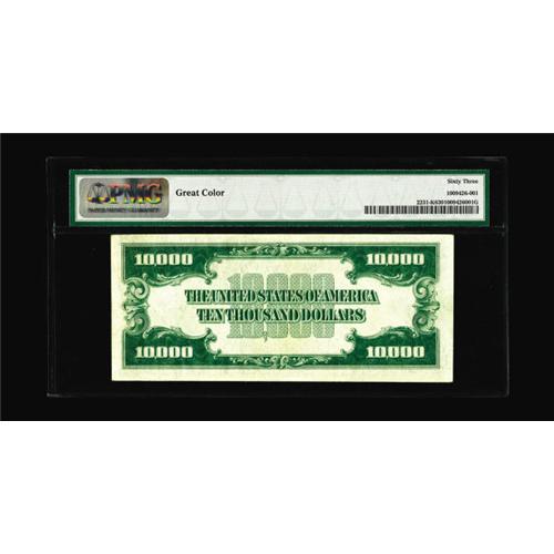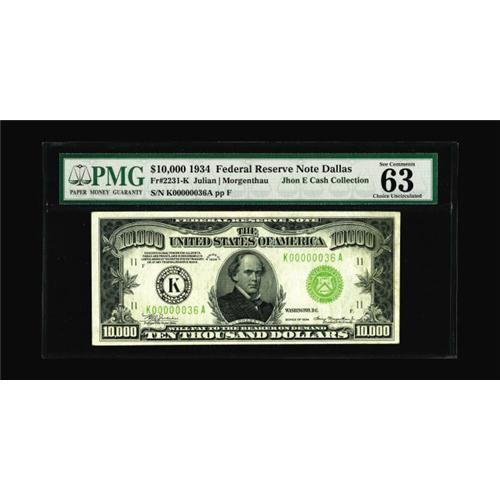 <B>Fr. 2231-K $10000 1934 Federal Reserve Note. PMG Choice Uncirculated 63.</B></I><BR>This glorious example becomes the ninth $10000 note from the Dallas district reported. Nice margins and vivid inks are seen noted by PMG as "Great Color." We hope our estimate proves a bit conservative at...