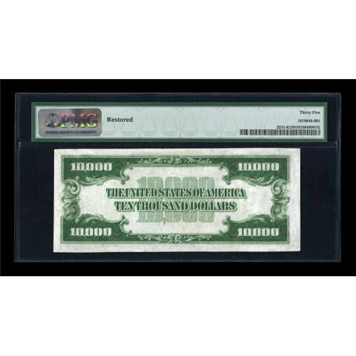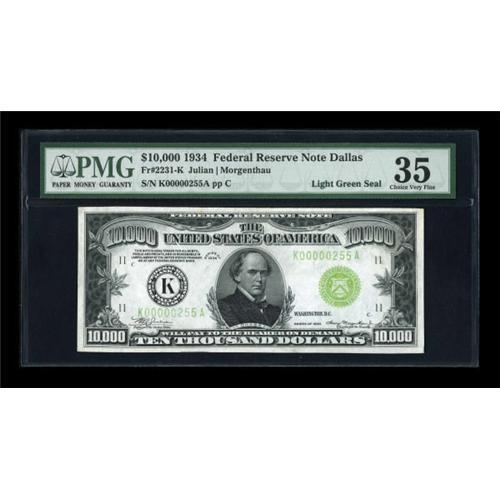 <B>Fr. 2231-K $10000 1934 Federal Reserve Note. PMG Choice Very Fine 35.</B></I><BR> Bright in appearance, but with a small restoration, which PMG has noted on the holder. Dallas is not a common district for $10,000 notes, and this example displays good eye appeal and bright colors despite its small problem. Our estimate here is likely to be proved conservative, perhaps by a wide margin. <BR><BR><b>Shipping:</b> Coins & Currency (<a target="_blank" href="http://www.heritageauctions.com/common/shipping.php">view shipping information</a>)