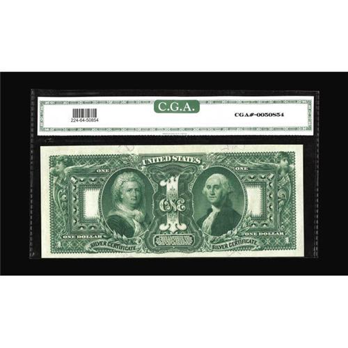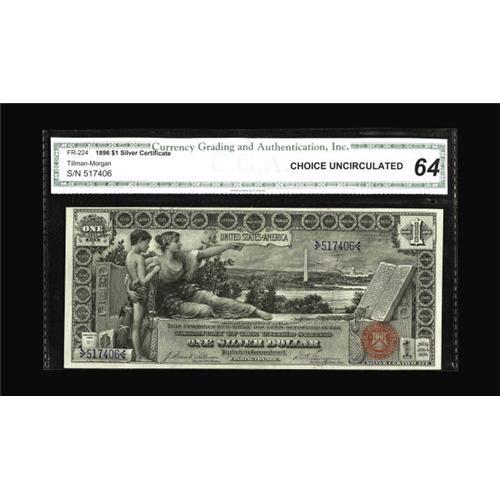 <B>Fr. 224 $1 1896 Silver Certificate CGA Choice Uncirculated 64.</B></I> Bright paper and bold colors highlight this Educational Ace.
