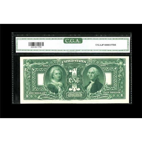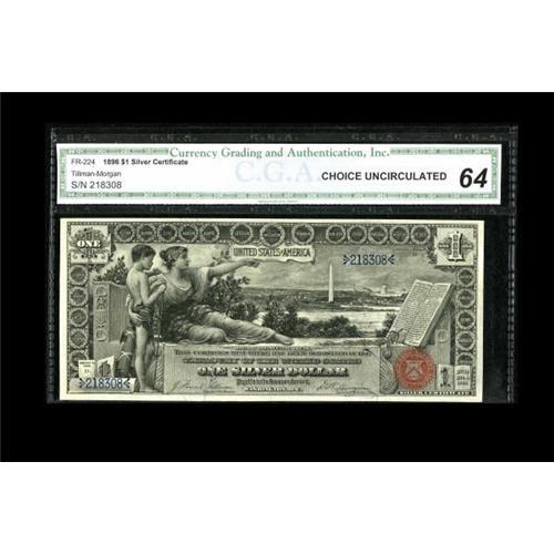 <B>Fr. 224 $1 1896 Silver Certificate CGA Choice Uncirculated 64.</B></I> The margins are strong and the colors vivid on this pleasing Educational Ace. <BR><BR><b>Shipping:</b> Coins & Currency (<a target="_blank" href="http://www.heritageauctions.com/common/shipping.php">view shipping information</a>)