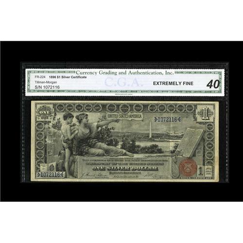 <B>Fr. 224 $1 1896 Silver Certificate CGA Extremely Fine 40.</B></I> This Educational Ace exhibits three hard folds and a touch of aging.