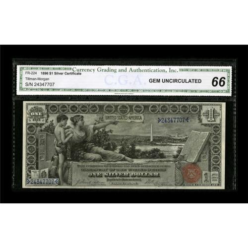<B>Fr. 224 $1 1896 Silver Certificate CGA Gem Uncirculated 66.</B></I> Sufficient margins for the grade are noted on all four sides. The overprint is bold and the paper is bright.<BR><BR><b>Shipping:</b> Coins & Currency (<a target="_blank" href="http://www.heritageauctions.com/common/shipping.php">view shipping information</a>)