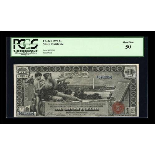<B>Fr. 224 $1 1896 Silver Certificate PCGS About New 50.</B></I> A bright and well centered $1 Educational that comes close to the uncirculated category and yet does not quite make it.<BR><BR><b>Shipping:</b> Coins & Currency (<a target="_blank" href="http://www.heritageauctions.com/common/shipping.php">view shipping information</a>)
