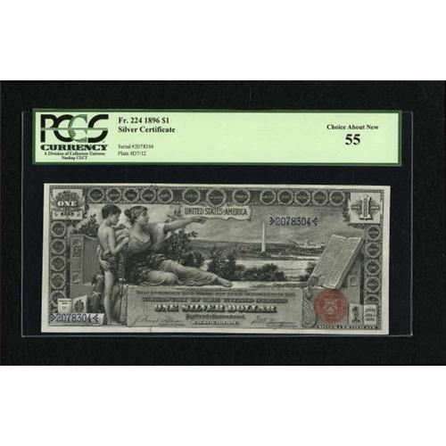 <B>Fr. 224 $1 1896 Silver Certificate PCGS Choice About New 55.</B></I> The color, margins and general appearance of this note are of a higher grade. <BR><BR><b>Shipping:</b> Coins & Currency (<a target="_blank" href="http://www.heritageauctions.com/common/shipping.php">view shipping information</a>)