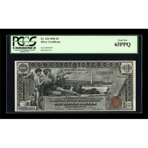 <B>Fr. 224 $1 1896 Silver Certificate PCGS Gem New 65PPQ.</B></I> Here is a wonderful example that has deep, penetrating inks and well proportioned margins. A quality note that will be sure to please.<BR><BR><b>Shipping:</b> Coins & Currency (<a target="_blank" href="http://www.heritageauctions.com/common/shipping.php">view shipping information</a>)