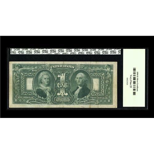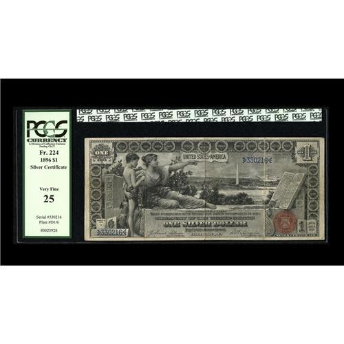 <B>Fr. 224 $1 1896 Silver Certificate PCGS Very Fine 25.</B></I> This wonderful Educational Ace remains quite bright despite the presence of hard folds.
