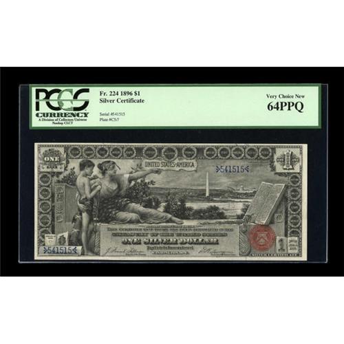 <B>Fr. 224 $1 1896 Silver Certificate PCGS Very Choice New 64PPQ.</B></I> Nice centering and powerful inks on this ever popular "History Instructing Youth" design. Decent margins and plenty of embossing also attest to the originality of this note.<BR><BR><b>Shipping:</b> Coins & Currency (<a target="_blank" href="http://www.heritageauctions.com/common/shipping.php">view shipping information</a>)