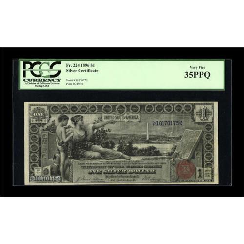 <B>Fr. 224 $1 1896 Silver Certificate PCGS Very Fine 35PPQ.</B></I> Wholly original paper shows some light folds and absolutely no distractions.<BR><BR><b>Shipping:</b> Coins & Currency (<a target="_blank" href="http://www.heritageauctions.com/common/shipping.php">view shipping information</a>)