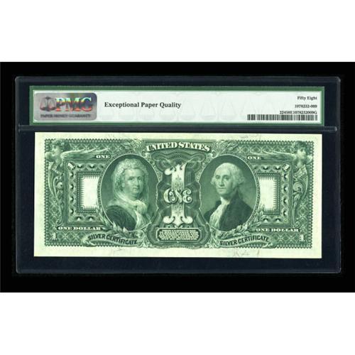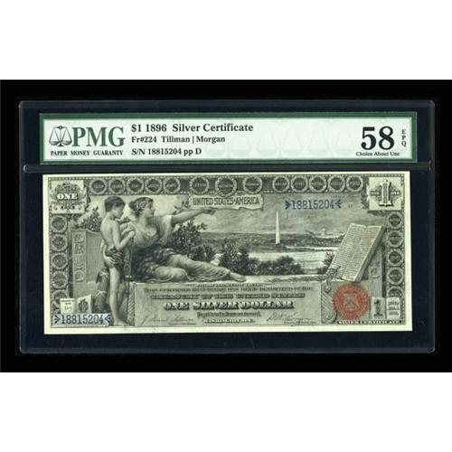 <B>Fr. 224 $1 1896 Silver Certificate PMG Choice About Unc 58 EPQ.</B></I> Some handling is detected on this bright and deeply inked Educational ace.<BR><BR><b>Shipping:</b> Coins & Currency (<a target="_blank" href="http://www.heritageauctions.com/common/shipping.php">view shipping information</a>)