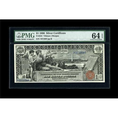 <B>Fr. 224 $1 1896 Silver Certificate PMG Choice Uncirculated 64 EPQ.</B></I> This pleasing, well inked note is nicely margined with decent back centering also noticed.<BR><BR><b>Shipping:</b> Coins & Currency (<a target="_blank" href="http://www.heritageauctions.com/common/shipping.php">view shipping information</a>)