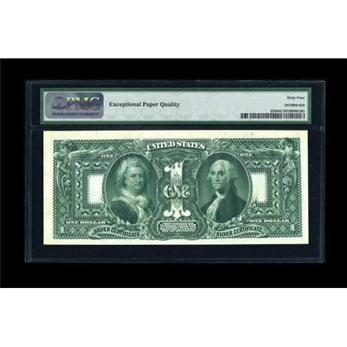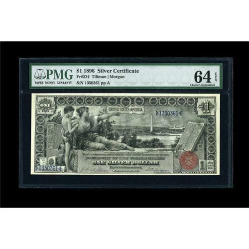 <B>Fr. 224 $1 1896 Silver Certificate PMG Choice Uncirculated 64 EPQ.</B></I> When we last sold this note in January of 1996, we said, "A hair more bottom margin and this fresh, strictly original One Dollar Ed would be a Superb Gem." It still applies today, the note was limited to its 64 EPQ grade only by a slightly sparse bottom margin.<BR><BR><b>Shipping:</b> Coins & Currency (<a target="_blank" href="http://www.heritageauctions.com/common/shipping.php">view shipping information</a>)
