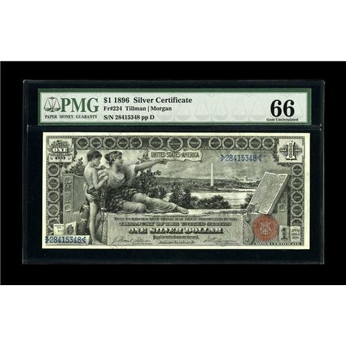 <B>Fr. 224 $1 1896 Silver Certificate PMG Gem Uncirculated 66.</B></I> Wide margins surround this lovely $1 Educational that is well inked and appears to have well deserved its exalted grade.<BR><BR><b>Shipping:</b> Coin/Currency (<a target="_blank" href="http://www.heritageauctions.com/common/shipping.php">view shipping information</a>)