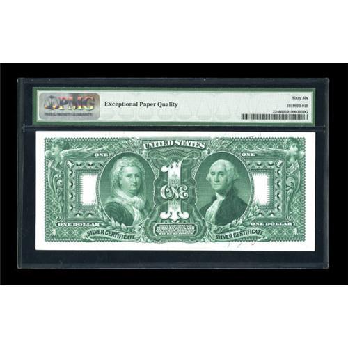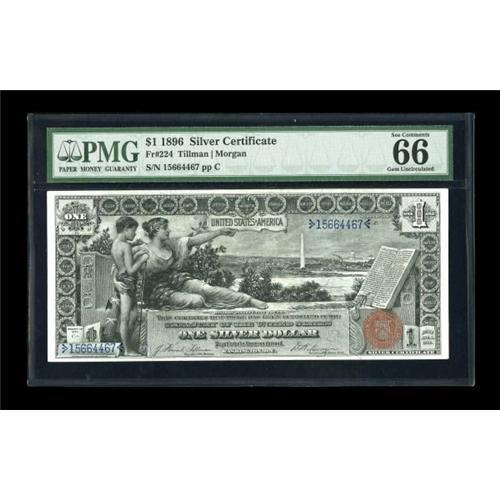 <B>Fr. 224 $1 1896 Silver Certificate PMG Gem Uncirculated 66 EPQ.</B></I> This piece comes from the Stella Collection, which we sold in January of this year. It's a bright and broadly margined specimen which richly deserves the PMG Gem Uncirculated 66 EPQ designation it received. This example realized over $6000 when last offered, and, with similarly graded notes bringing prices in excess of that amount in recent months, a similar if not higher realization is likely in order this evening. <BR><BR><b>Shipping:</b> Coins & Currency (<a target="_blank" href="http://www.heritageauctions.com/common/shipping.php">view shipping information</a>)