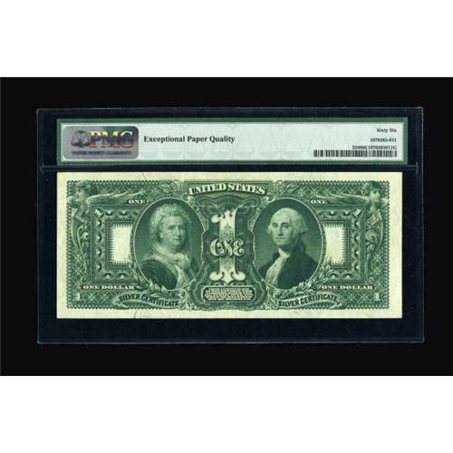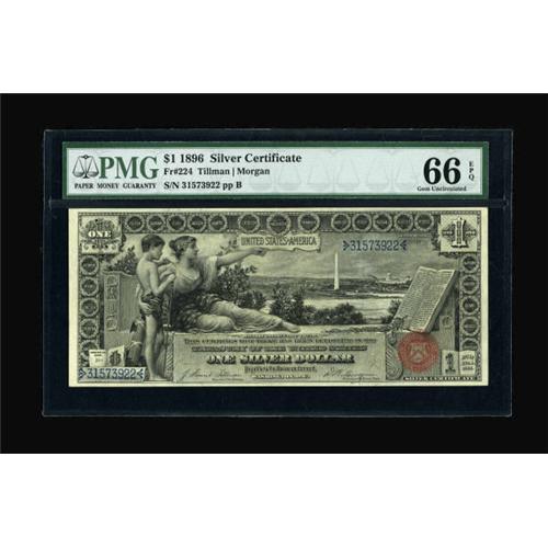<B>Fr. 224 $1 1896 Silver Certificate PMG Gem Uncirculated 66 EPQ.</B></I> Quite possibly the most popular Large Size Type Note, and, luckily for collectors, a note that is readily available in Uncirculated condition. At the very upper end of the grade scale, however, these become far less common. This one appears to have earned every point.<BR><BR><b>Shipping:</b> Coins & Currency (<a target="_blank" href="http://www.heritageauctions.com/common/shipping.php">view shipping information</a>)