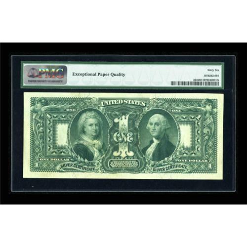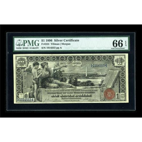 <B>Fr. 224 $1 1896 Silver Certificate PMG Gem Uncirculated 66 EPQ.</B></I> The margins are not perfectly even, but they are more than large enough all around to support the grade. Although not truly rare at this level, demand is so strong that the price levels are not only sustainable, but are constantly on the rise. <BR><BR><b>Shipping:</b> Coins & Currency (<a target="_blank" href="http://www.heritageauctions.com/common/shipping.php">view shipping information</a>)