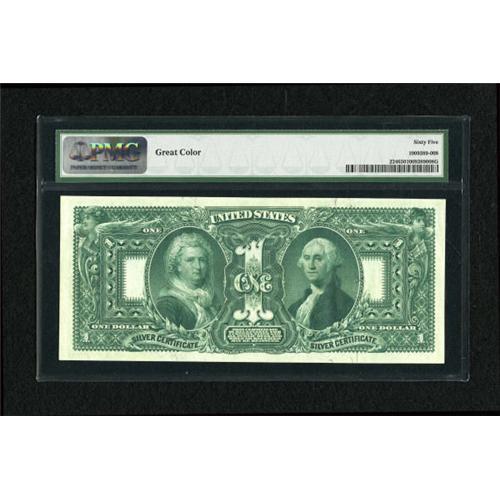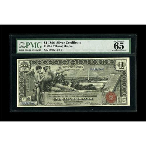 <B>Fr. 224 $1 1896 Silver Certificate PMG Gem Uncirculated 65.</B></I> PMG has commented about the "Great Color" this note possesses. Bountiful margins and excellent centering are also noticed.<BR><BR><b>Shipping:</b> Coins & Currency (<a target="_blank" href="http://www.heritageauctions.com/common/shipping.php">view shipping information</a>)