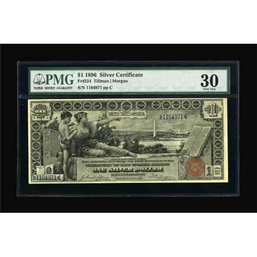 <B>Fr. 224 $1 1896 Silver Certificate PMG Very Fine 30.</B></I> All the printed details are bold and uninterrupted by the folds that account for the grade. The margins are solid, though the paper is a touch toned.<B><BR></B></I><I>From The John Ameen Collection</B></I><BR><BR><b>Shipping:</b> Coins & Currency (<a target="_blank" href="http://www.heritageauctions.com/common/shipping.php">view shipping information</a>)