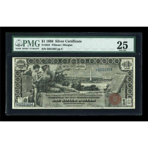 <B>Fr. 224 $1 1896 Silver Certificate PMG Very Fine 25.</B></I> Solid eye appeal is noted on this attractive and vividly colored note.<BR><BR><b>Shipping:</b> Coins & Currency (<a target="_blank" href="http://www.heritageauctions.com/common/shipping.php">view shipping information</a>)