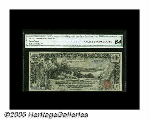 <B>Fr. 225 $1 1896 Silver Certificate CGA Choice Uncirculated 64.</B></I> A handsome example of what many consider to be the most attractively designed Large sized currency note.