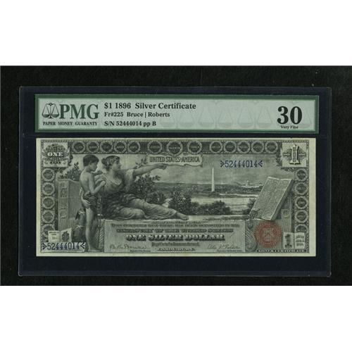 <B>Fr. 225 $1 1896 Silver Certificate PMG Very Fine 30.</B></I> An attractive and original Educational Ace that appears fully EF in the holder. The colors are bold and uninterrupted.<BR><BR><b>Shipping:</b> Coins & Currency (<a target="_blank" href="http://www.heritageauctions.com/common/shipping.php">view shipping information</a>)