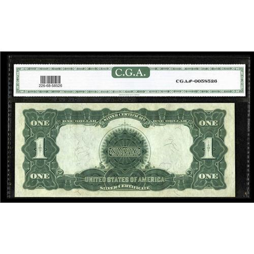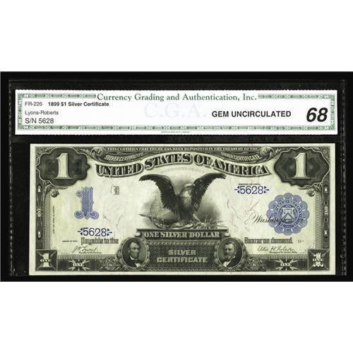 <B>Fr. 226 $1 1899 Silver Certificate CGA Gem Uncirculated 68.</B></I> This four-digit beauty that has plainly evident original embossing, huge margins and ideal colors has been off the market since a 1977 Dean Oaks fixed price list. Prior to that, it appeared in a 1974 Bill Donlon sale. A very lovely example of the earliest Black Eagle number.