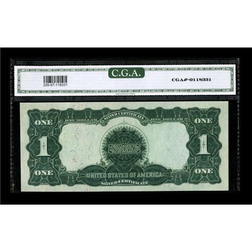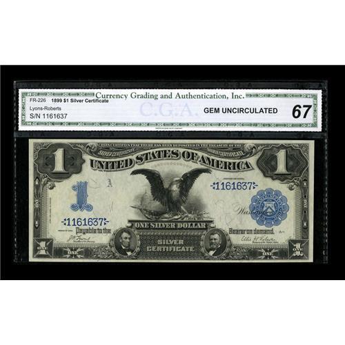 <B>Fr. 226 $1 1899 Silver Certificate CGA Gem Uncirculated 67.</B></I> Hugely margined all around, with spectacular color and great eye appeal. This is the first number of the extraordinarily popular Black Eagle series, and the only number with the series date above the serial number.<BR><BR><b>Shipping:</b> Coins & Currency (<a target="_blank" href="http://www.heritageauctions.com/common/shipping.php">view shipping information</a>)
